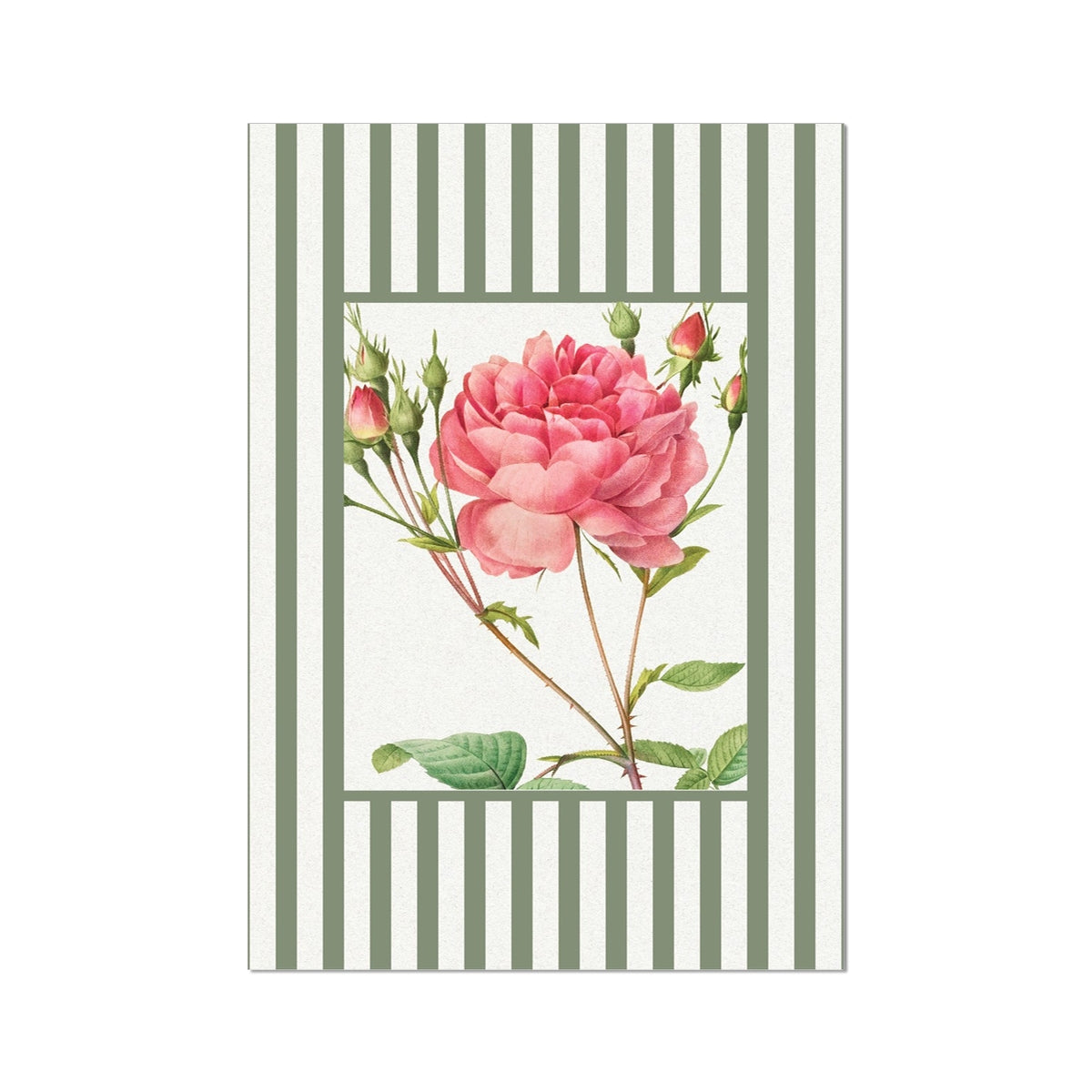 Vintage Rose Botanical Print with Striped Border This elegant vintage rose botanical print combines classic floral illustration with a refined striped border design. The detailed heritage rose is set against a soft olive green stripe, creating a timeless artwork that brings calm, romantic character to modern interiors. Timeless Floral Wall Read More