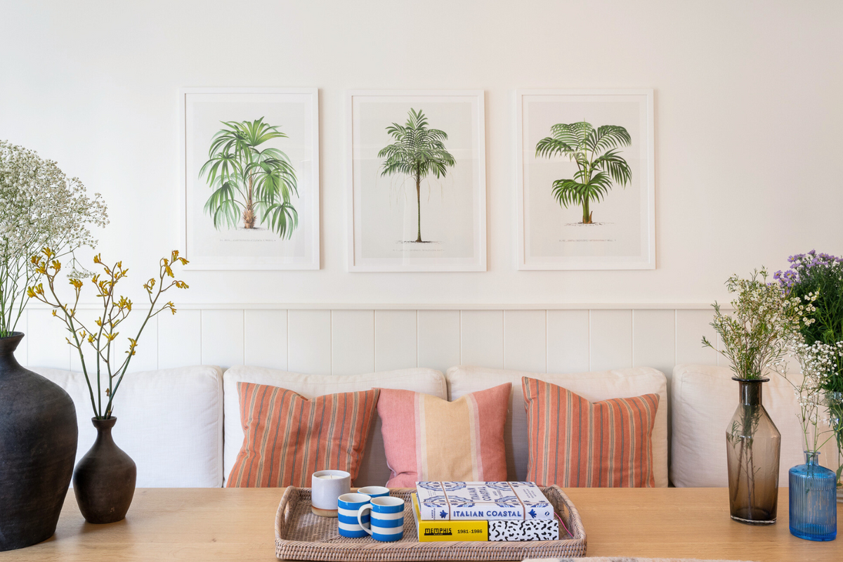 Sets of three wall art prints are perfect for styling above a sofa or sideboard, where they help ground the furniture and create a strong visual focal point.