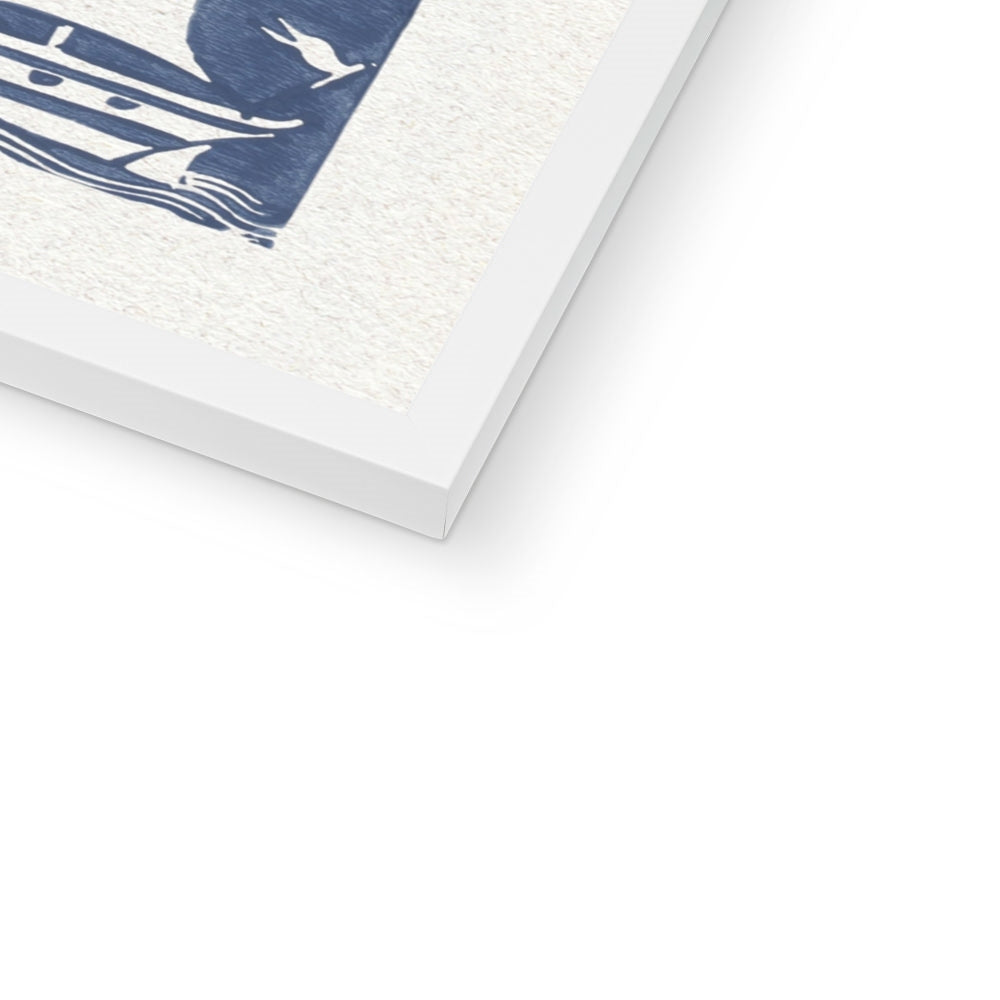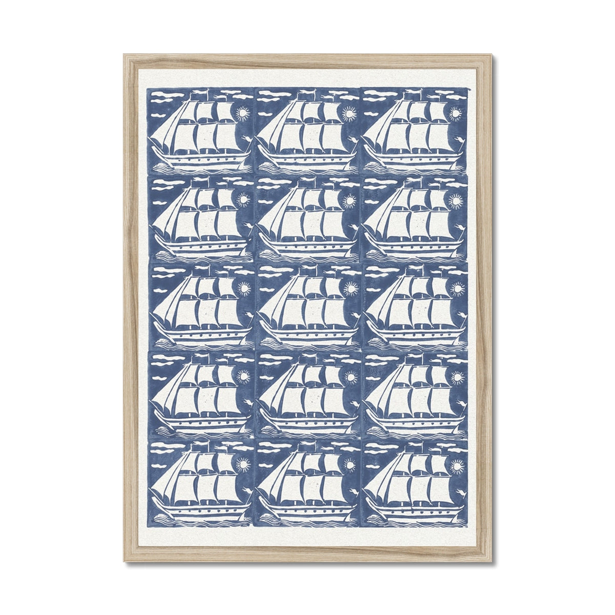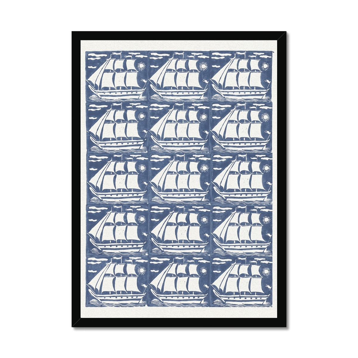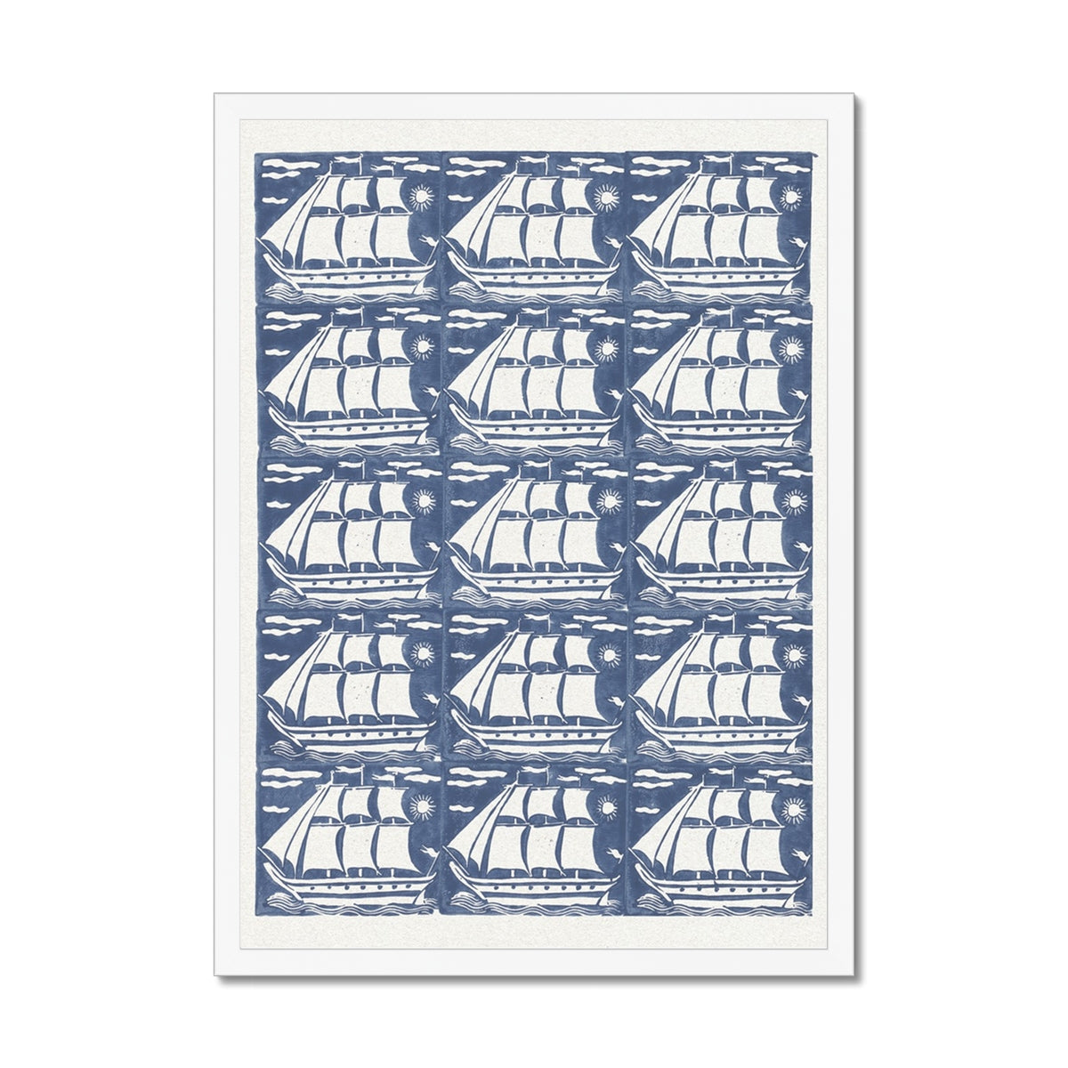 Vintage Ship Art | Blue & White Folk Ship Pattern Print - Framed